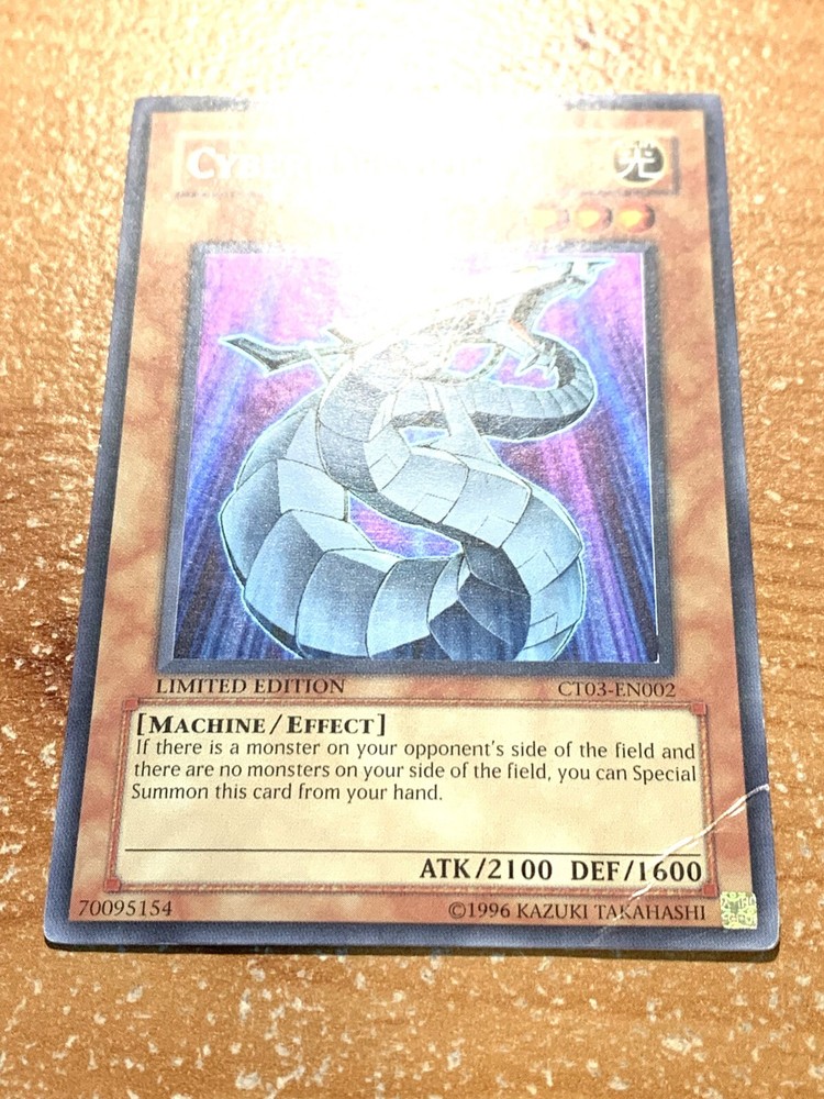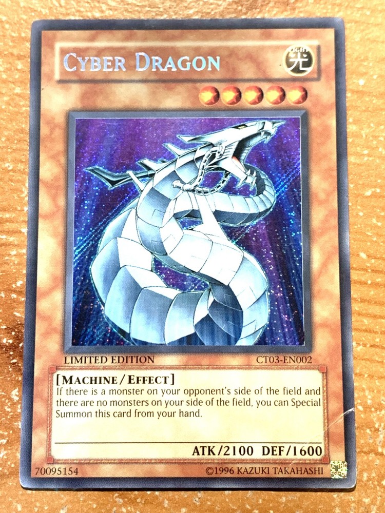 This auction is for (1x) one of the card listed in the title, in the condition listed in the title Cyber Dragon CT03-EN002 Secret Rare - Limited Edition Damage Old School Vintage North America If the condition is not specified the items will be in mint/near mint condition See our grading scale for details. FOR TRADING CARDS: CONDITION INFORMATION v Near Mint (NM) – Card will be Mint or very close to it. v Lightly Played (LP) – Card will have edge wear and/or small dents, but no major creases. v Moderately Played/Played (MP/P) – Card will have visible creases, dents and/or edge wear. v Heavily Played (HP) – Card will noticeable damage such as large creases and/or heavy edge wear. v Damaged (Da) - Card will be in very played condition, heavy edgewear, large creases, entire card may be played. SHIPPING INFORMATION Ø Your items will be shipped out within 24 hours of purchase on BUSINESS DAYS ONLY . This excludes Saturdays, Sundays, and US Holidays. Please allow 2-9 business days for USPS to deliver your items Ø Please add all items to your cart prior to checkout to ensure your items are mailed together. Ø VERY IMPORTANT - PLEASE READ!!! Check your shipping address prior to check out to be sure that we are sending it to the correct address!!! Please be sure to include apartment or unit #’s when applicable. · A PLAYMAT will be shipped in a cardboard tube and tracking information will be included. Multiple playmats will be shipped in a large bubble mailer. · SLEEVES will be shipped in a bubble mailer and tracking information will be included. · CARDS will be placed into a top loader and a sleeve during shipping for protection. Purchases over $15 will have tracking information, free of charge. · FULL DECKS will be sleeved, placed in a deck box, and shipped in a bubble mailer. Tracking will be included. WE SHIP INTERNATIONALLY!!! International Buyers - Please Note: Import duties, taxes, and charges are not included in the item price or shipping cost. These charges are the buyer's responsibility. Please check with your country's customs office to determine what these additional costs will be prior to bidding or buying. · Excludes South America – NO EXCEPTIONS · We will not claim less than the value of what you purchase, so please do not ask. · We ship via the Global Shipping program. Shipping charges are created by eBay and received by their third party shipping department, therefore we do not have any control over the prices. o Includes tracking information (even outside the U.S.). o Insurance for package is also included. FEEL SAFE WHEN SHOPPING WITH US THANK YOU FOR SHOPPING WITH US, PLEASE CHECK OUT OUR OTHER ITEMS FOR MORE GREAT DEALS!