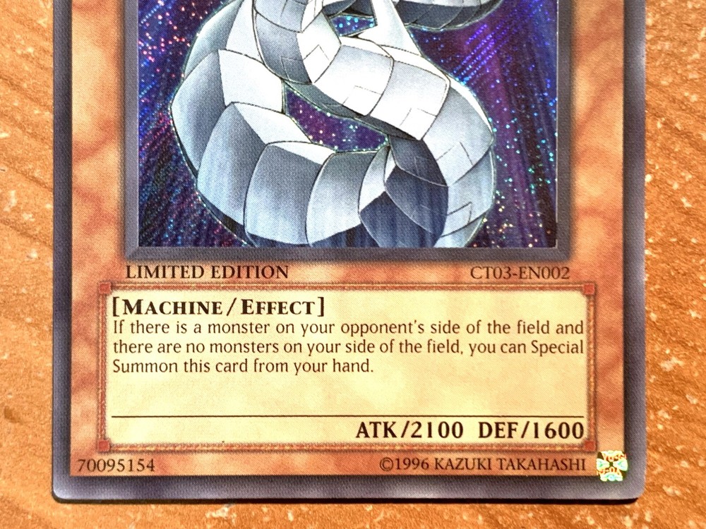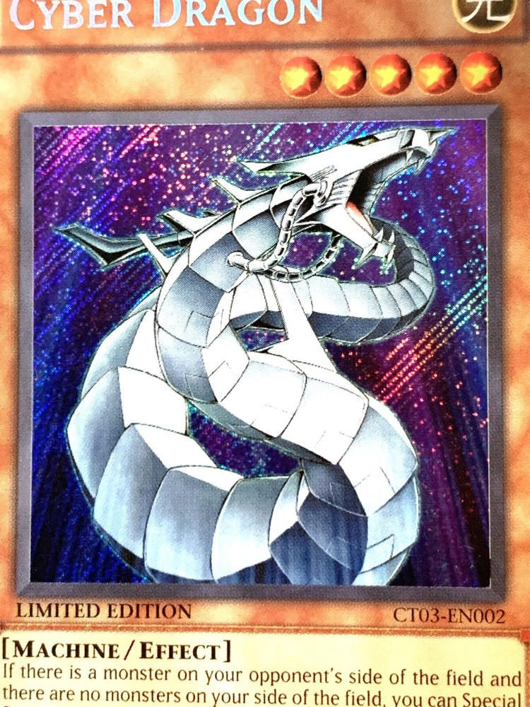 This auction is for (1x) one of the card listed in the title, in the condition listed in the title Cyber Dragon CT03-EN002 Secret Rare - Limited Edition near mint Old School Vintage North America If the condition is not specified the items will be in mint/near mint condition See our grading scale for details. FOR TRADING CARDS: CONDITION INFORMATION v Near Mint (NM) – Card will be Mint or very close to it. v Lightly Played (LP) – Card will have edge wear and/or small dents, but no major creases. v Moderately Played/Played (MP/P) – Card will have visible creases, dents and/or edge wear. v Heavily Played (HP) – Card will noticeable damage such as large creases and/or heavy edge wear. v Damaged (Da) - Card will be in very played condition, heavy edgewear, large creases, entire card may be played. SHIPPING INFORMATION Ø Your items will be shipped out within 24 hours of purchase on BUSINESS DAYS ONLY . This excludes Saturdays, Sundays, and US Holidays. Please allow 2-9 business days for USPS to deliver your items Ø Please add all items to your cart prior to checkout to ensure your items are mailed together. Ø VERY IMPORTANT - PLEASE READ!!! Check your shipping address prior to check out to be sure that we are sending it to the correct address!!! Please be sure to include apartment or unit #’s when applicable. · A PLAYMAT will be shipped in a cardboard tube and tracking information will be included. Multiple playmats will be shipped in a large bubble mailer. · SLEEVES will be shipped in a bubble mailer and tracking information will be included. · CARDS will be placed into a top loader and a sleeve during shipping for protection. Purchases over $15 will have tracking information, free of charge. · FULL DECKS will be sleeved, placed in a deck box, and shipped in a bubble mailer. Tracking will be included. WE SHIP INTERNATIONALLY!!! International Buyers - Please Note: Import duties, taxes, and charges are not included in the item price or shipping cost. These charges are the buyer's responsibility. Please check with your country's customs office to determine what these additional costs will be prior to bidding or buying. · Excludes South America – NO EXCEPTIONS · We will not claim less than the value of what you purchase, so please do not ask. · We ship via the Global Shipping program. Shipping charges are created by eBay and received by their third party shipping department, therefore we do not have any control over the prices. o Includes tracking information (even outside the U.S.). o Insurance for package is also included. FEEL SAFE WHEN SHOPPING WITH US THANK YOU FOR SHOPPING WITH US, PLEASE CHECK OUT OUR OTHER ITEMS FOR MORE GREAT DEALS!