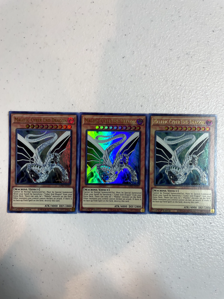 This playset of Malefic Cyber End Dragon is a must-have for any serious Yu-Gi-Oh! collector or duelist. The ultra rare cards look stunning with their holographic finish, and they arrived in perfect near mint condition, just as described. The artwork is sharp, and the cards feel premium—great for competitive play or display. Highly recommended for fans of the Malefic archetype!